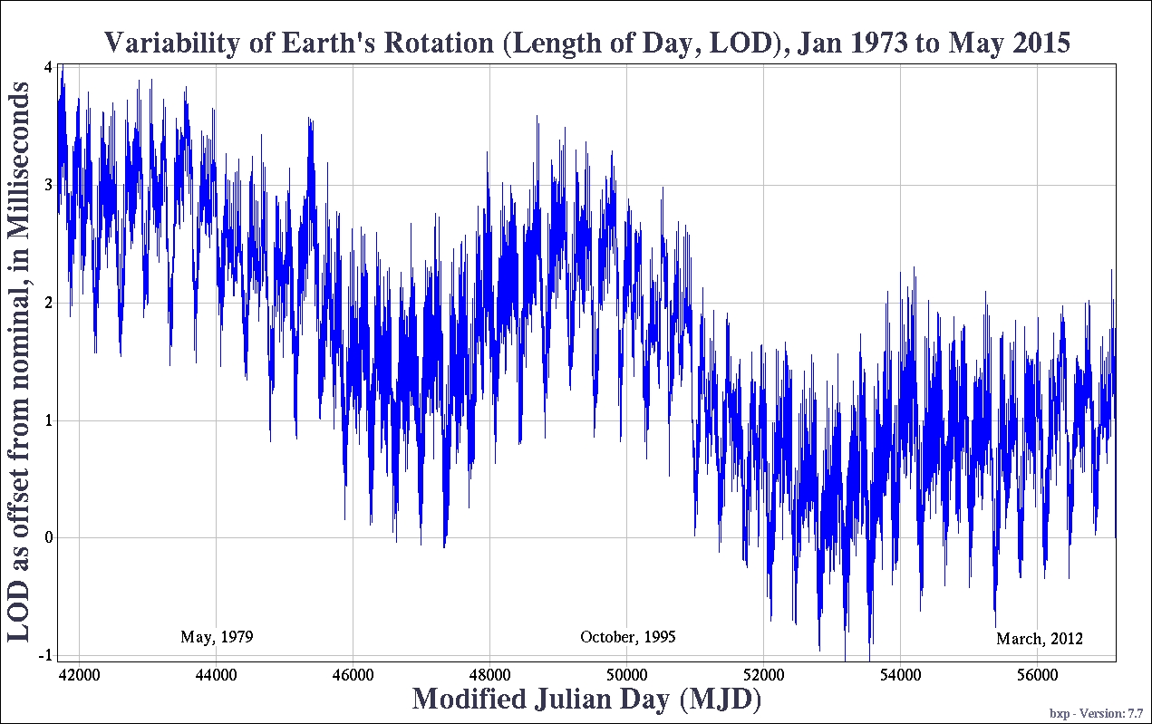 And why do we sometimes add that extra second? The reason is the unequable Earth’s rotation. The Earth fluctuates unpredictably year to a year, as a result of the Moon’s tidal pull acting like a break on our planet. The Earth’s rotation is sometimes getting longer, sometimes shorter. But generally, the Earth is gradually slowing down year after year. Measurements show that the Earth, on average, runs slow compared to atomic time, at about 1.5 to 2 milliseconds per day.