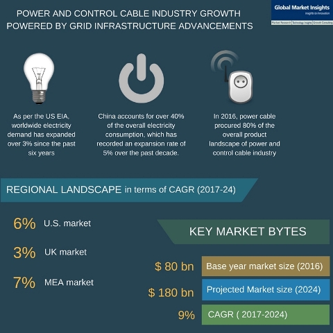 Taking into account the macro-economic growth and the significant efforts taken worldwide toward environmental viability, it is quite certain that the grid structure across emerging economies is set to undergo a consequential transformation in the coming period, leaving a subsequent impact on power and control cable market share. In light of these fundamental aspects, leading companies are investing in product innovation not only for greater cost competitiveness, but also for gathering enough substantiations with regards to the environmental impact. With rapid industrialization across major economies, these giants are also adopting novel organic strategies to score a competitive advantage at a global level, which undoubtedly has pushed the profitability index of power and control cable industry. A recent report put together by Global Market Insights, Inc. depicts that global power and control cable industry would record a massive valuation of USD 180 billion by 2024, with a projected CAGR of 9% over 2017-2024.